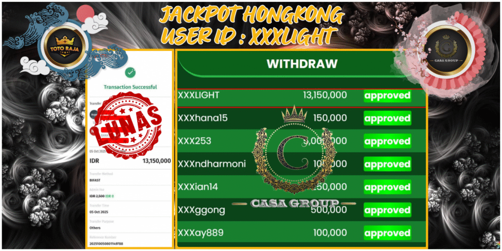 Selamat atas jackpot paus untuk member TOTORAJA dengan user id : xxxht yang telah berhasil menang pada pasaran HONGKONG sebesar Rp. 13.150.000 ,-