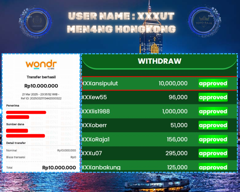 Selamat atas jackpot paus untuk member TOTORAJA dengan user id : xxxUT yang telah berhasil menang pada pasaran HONGKONG sebesar Rp. 10.000.000 ,-