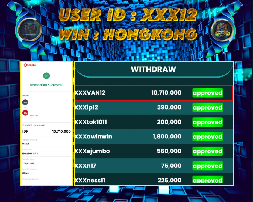 Selamat atas jackpot paus untuk member TOTOWAYANG dengan user id : xxx12 yang telah berhasil menang pada pasaran HONGKONG sebesar Rp. 10.710.000 ,-