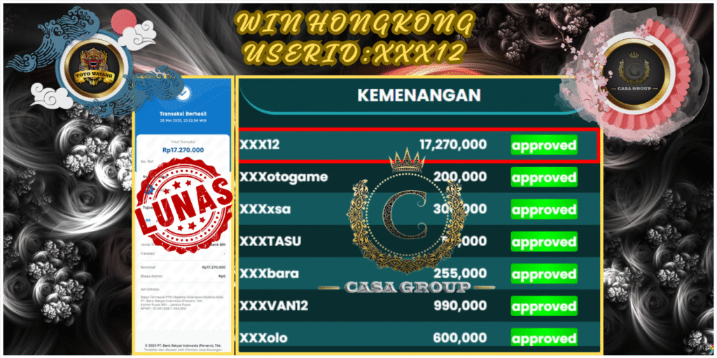 Selamat atas jackpot paus untuk member TOTOWAYANG dengan user id : xxx12 yang telah berhasil menang pada pasaran HONGKONG sebesar Rp. 17.270.000 ,-