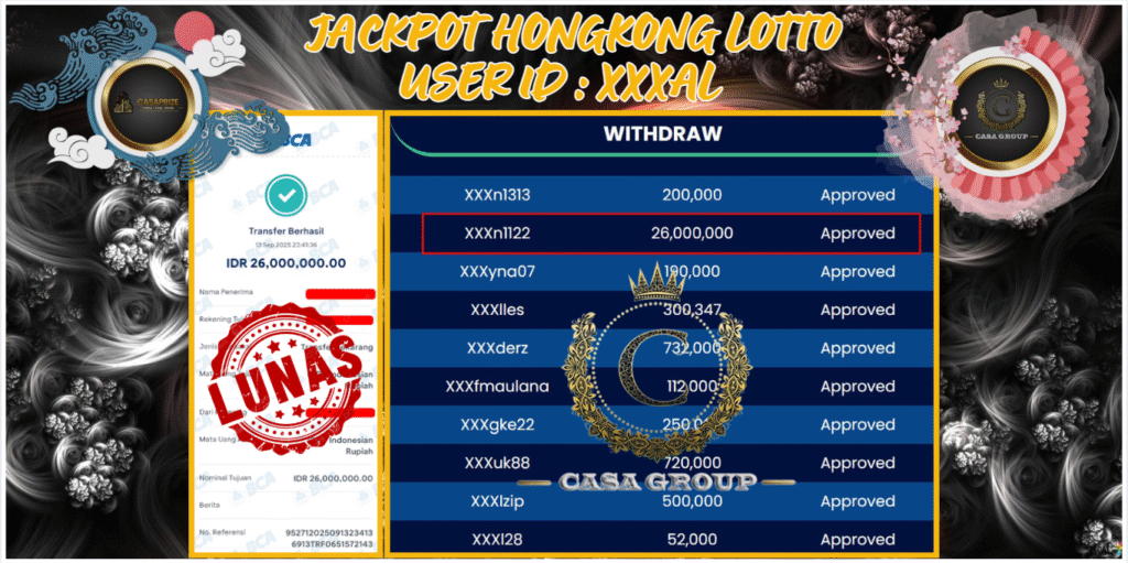 Selamat atas jackpot paus untuk member CASAPRIZE dengan user id : xxx22 yang telah berhasil menang pada pasaran HONGKONG LOTTO sebesar Rp. 26.000.000 ,-