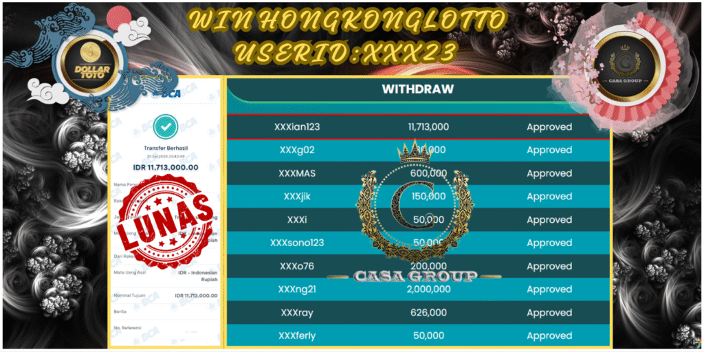 Selamat atas jackpot paus untuk member DOLLARTOTO dengan user id : xxx23 yang telah berhasil menang pada pasaran HONGKONG LOTTO sebesar Rp. 11.713.000 ,-