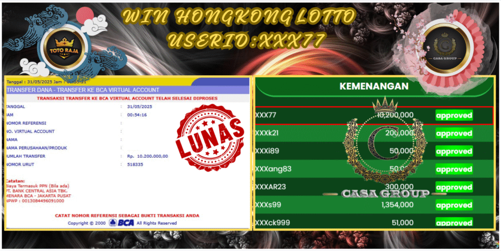 Selamat atas jackpot paus untuk member TOTORAJA dengan user id : xxx77 yang telah berhasil menang pada pasaran HONGKONG LOTTO sebesar Rp. 10.200.000 ,-