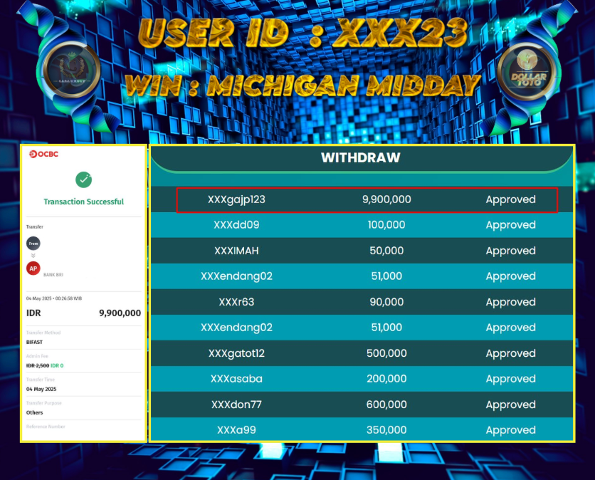 Selamat atas jackpot paus untuk member DOLLARTOTO dengan user id : xxx23 yang telah berhasil menang pada pasaran MICHIGAN MIDDAY sebesar Rp. 9.900.000 ,-