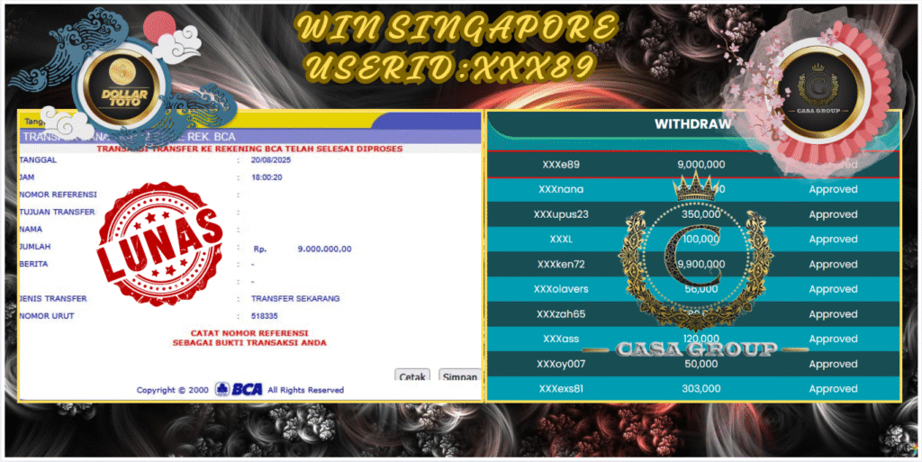 Selamat atas jackpot paus untuk member DOLLARTOTO dengan user id : xxx89 yang telah berhasil menang pada pasaran SINGAPORE sebesar Rp. 9.000.000 ,-