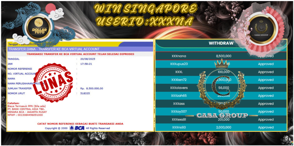 Selamat atas jackpot paus untuk member DOLLARTOTO dengan user id : xxxna yang telah berhasil menang pada pasaran SINGAPORE sebesar Rp. 8.500.000 ,-