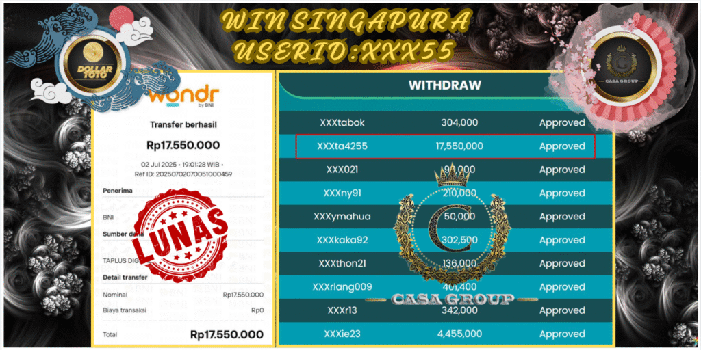Selamat atas jackpot paus untuk member DOLLARTOTO dengan user id : xxx55 yang telah berhasil menang pada pasaran SINGAPORE sebesar Rp. 17.550.000 ,-