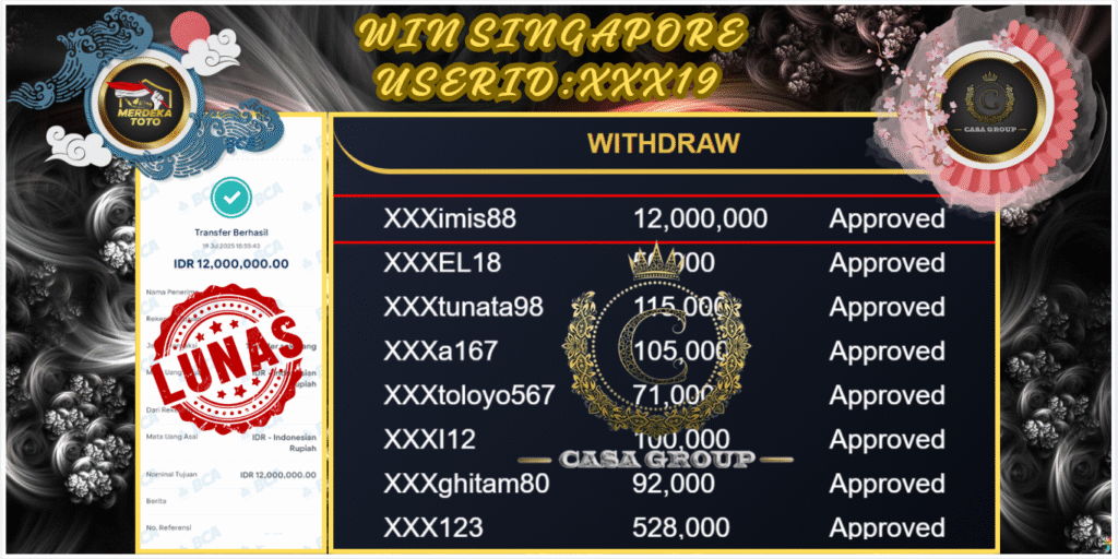 Selamat atas jackpot paus untuk member MERDEKATOTO dengan user id : xxx88 yang telah berhasil menang pada pasaran SINGAPORE sebesar Rp. 12.000.000 ,-