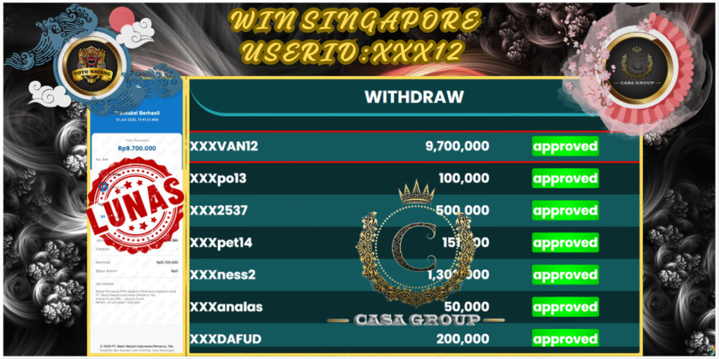 Selamat atas jackpot paus untuk member TOTOWAYANG dengan user id : xxx12 yang telah berhasil menang pada pasaran SINGAPORE sebesar Rp. 9.700.000 ,-