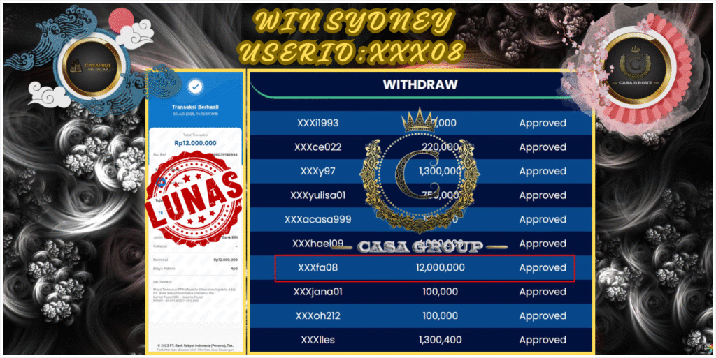 Selamat atas jackpot paus untuk member CASAPRIZE dengan user id : xxx08 yang telah berhasil menang pada pasaran SYDNEY sebesar Rp. 12.000.000 ,-