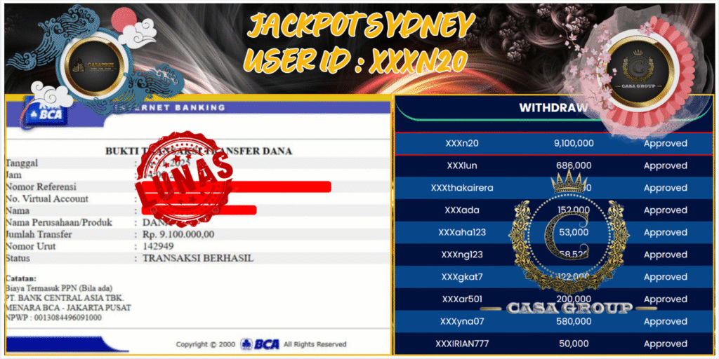 Selamat atas jackpot paus untuk member CASAPRIZE dengan user id : xxxN20 yang telah berhasil menang pada pasaran SYDNEY sebesar Rp. 9.100.000 ,-