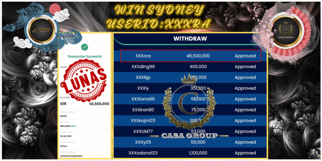 Selamat atas jackpot paus untuk member CASAPRIZE dengan user id : xxxRA yang telah berhasil menang pada pasaran SYDNEY sebesar Rp. 46.500.000 ,-