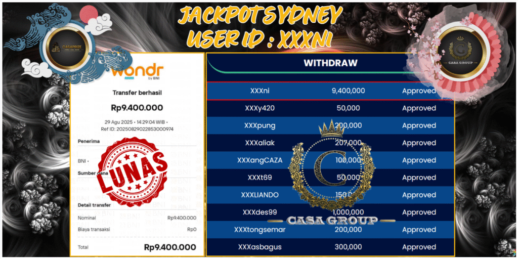 Selamat atas jackpot paus untuk member CASAPRIZE dengan user id : xxxni yang telah berhasil menang pada pasaran SYDNEY sebesar Rp. 9.400.000 ,-