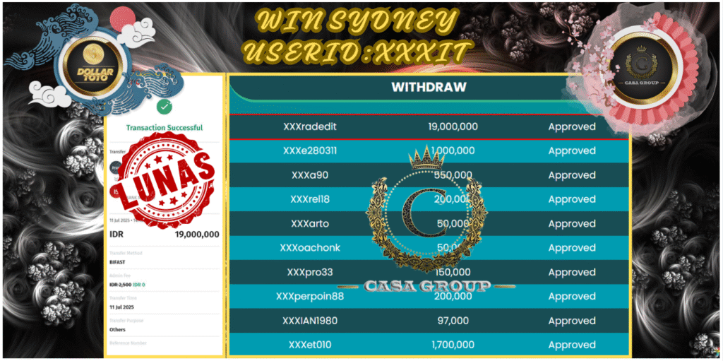 Selamat atas jackpot paus untuk member DOLLARTOTO dengan user id : xxxit yang telah berhasil menang pada pasaran SYDNEY sebesar Rp. 19.000.000 ,-