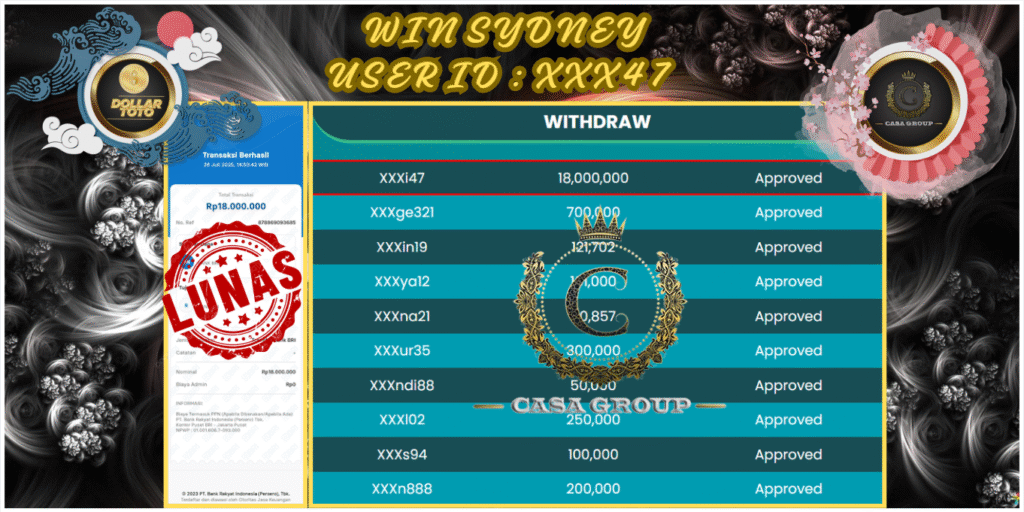 Selamat atas jackpot paus untuk member DOLLARTOTO dengan user id : xxx47 yang telah berhasil menang pada pasaran SYDNEY sebesar Rp. 18.000.000 ,-