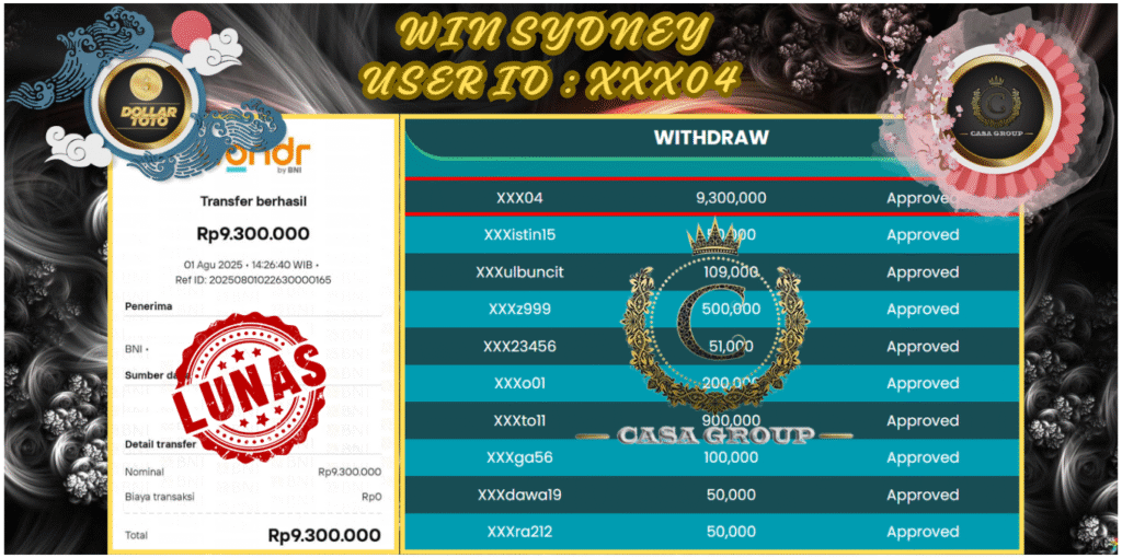 Selamat atas jackpot paus untuk member DOLLARTOTO dengan user id : xxx04 yang telah berhasil menang pada pasaran SYDNEY sebesar Rp. 9.300.000 ,-
