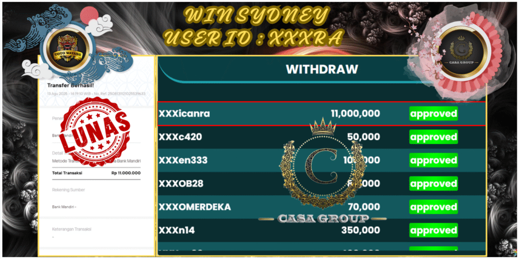 Selamat atas jackpot paus untuk member TOTOWAYANG dengan user id : xxxra yang telah berhasil menang pada pasaran SYDNEY sebesar Rp. 11.000.000 ,-