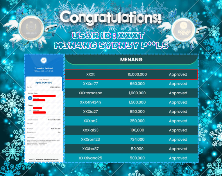 Selamat atas jackpot paus untuk member DOLLARTOTO dengan user id : xxxT yang telah berhasil menang pada pasaran SYDNEY POOLS sebesar Rp. 15.000.000 ,-