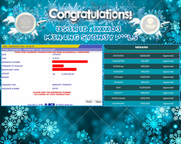 Selamat atas jackpot paus untuk member DOLLARTOTO dengan user id : xxx03 yang telah berhasil menang pada pasaran SYDNEY POOLS sebesar Rp. 11.800.000 ,-