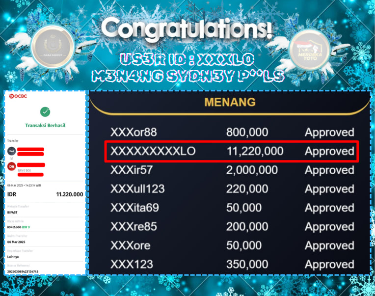Selamat atas jackpot paus untuk member merdekatoto dengan user id : xxxLO yang telah berhasil menang pada pasaran sydney pools sebesar Rp. 11 .220.000 ,-