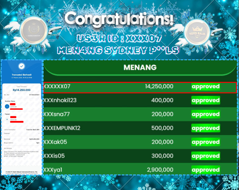 Selamat atas jackpot paus untuk member TOTORAJA dengan user id : xxx07 yang telah berhasil menang pada pasaran SYDNEY POOLS sebesar Rp. 14.000.000 ,-