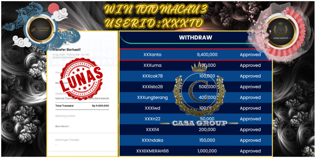 Selamat atas jackpot paus untuk member CASAPRIZE dengan user id : xxxto yang telah berhasil menang pada pasaran TOTO MACAU 3 sebesar Rp. 9.400.000 ,-