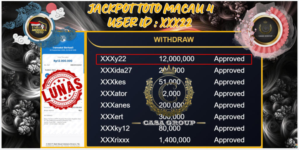 Selamat atas jackpot paus untuk member MERDEKATOTO dengan user id : xxx22 yang telah berhasil menang pada pasaran TOTO MACAU 4 sebesar Rp. 12.000.000 ,-