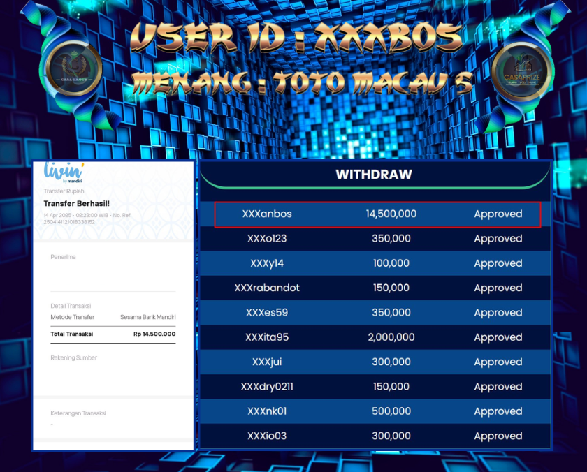 Selamat atas jackpot paus untuk member CASAPRIZE dengan user id : xxxBOS yang telah berhasil menang pada pasaran TOTO MACAU 5 sebesar Rp. 14.500.000 ,-