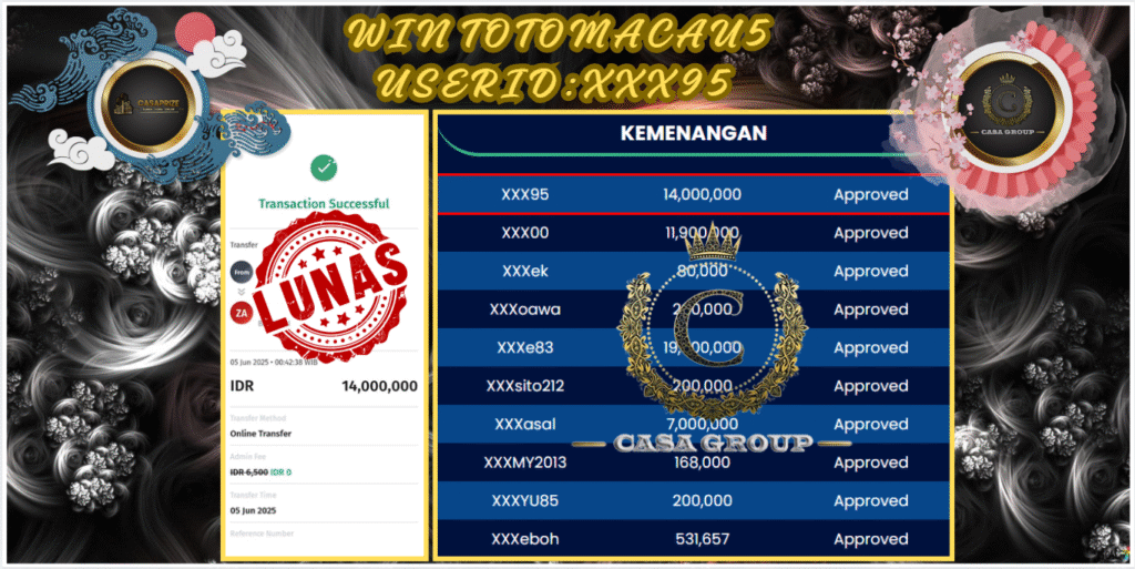 Selamat atas jackpot paus untuk member CASAPRIZE dengan user id : xxx95 yang telah berhasil menang pada pasaran TOTO MACAU 5 sebesar Rp. 14.000.000 ,-