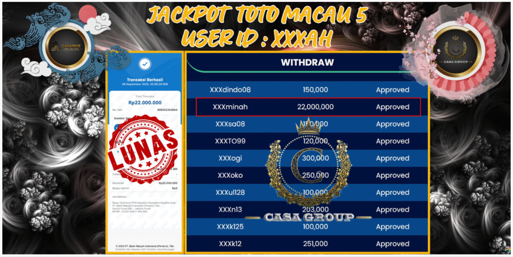 Selamat atas jackpot paus untuk member CASAPRIZE dengan user id : xxxah yang telah berhasil menang pada pasaran TOTO MACAU 5 sebesar Rp. 22.000.000 ,-