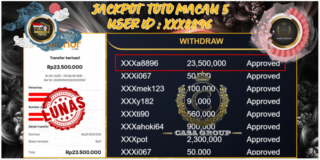 Selamat atas jackpot paus untuk member MERDEKATOTO dengan user id : xxx8896 yang telah berhasil menang pada pasaran TOTO MACAU 5 sebesar Rp. 23.500.000 ,-