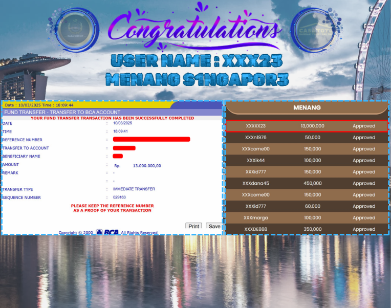 SELAMAT ATAS JACKPOT PAUS UNTUK MEMBER CASATOTO DENGAN USER ID : XXX23 YANG TELAH BERHASIL MENANG PADA PASARAN SINGAPORE SEBESAR Rp. 13.0000.000,-