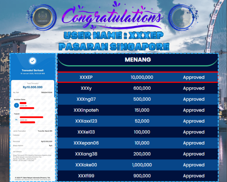 SELAMAT ATAS JACKPOT PAUS UNTUK MEMBER CASAPRIZE DENGAN USER ID : XXXEP YANG TELAH BERHASIL MENANG PADA PASARAN SINGAPORE SEBESAR Rp. 10.000.000,-
