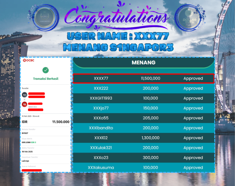 SELAMAT ATAS JACKPOT PAUS UNTUK MEMBER DOLLARTOTO DENGAN USER ID : XXX77 YANG TELAH BERHASIL MENANG PADA PASARAN SINGAPORE SEBESAR Rp. 11.500.000,-