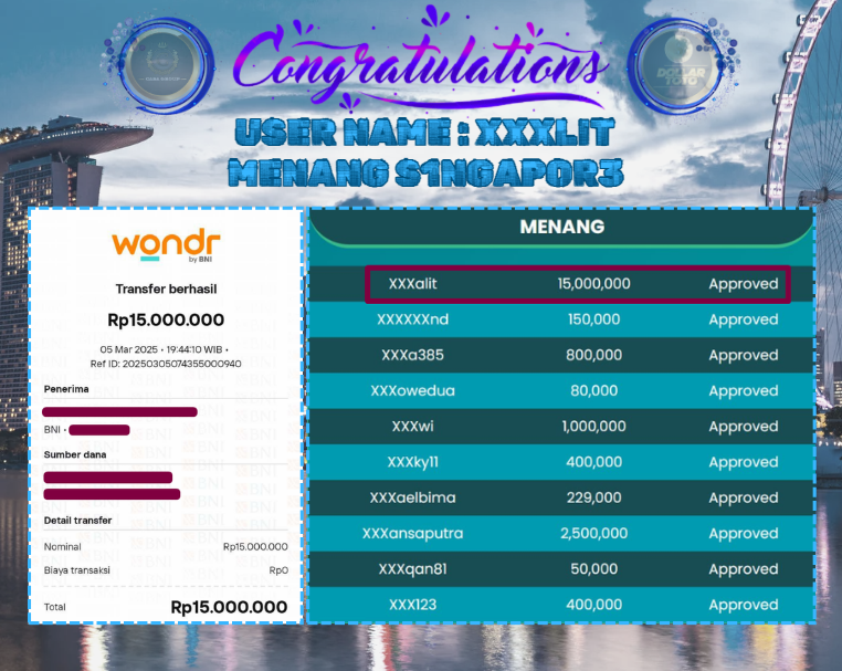 SELAMAT ATAS JACKPOT PAUS UNTUK MEMBER DOLLARTOTO DENGAN USER ID : XXXLIT YANG TELAH BERHASIL MENANG PADA PASARAN SINGAPORE SEBESAR Rp. 15.000.000,-
