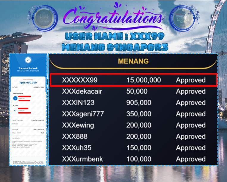 SELAMAT ATAS JACKPOT PAUS UNTUK MEMBER MERDEKATOTO DENGAN USER ID : XXX99 YANG TELAH BERHASIL MENANG PADA PASARAN SINGAPORE SEBESAR Rp. 15.000.000,-