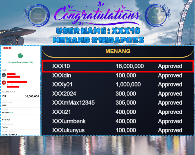 SELAMAT ATAS JACKPOT PAUS UNTUK MEMBER MERDEKATOTO DENGAN USER ID : XXX10 YANG TELAH BERHASIL MENANG PADA PASARAN SINGAPORE SEBESAR Rp. 16.000.000,-