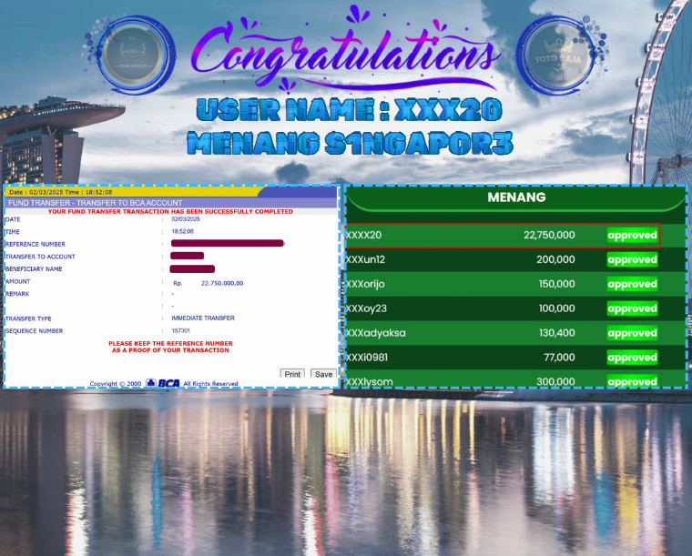 SELAMAT ATAS JACKPOT PAUS UNTUK MEMBER TOTORAJA DENGAN USER ID : XXX20 YANG TELAH BERHASIL MENANG PADA PASARAN SINGAPORE SEBESAR Rp. 22.750.000,-