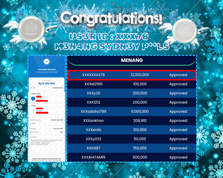 SELAMAT ATAS JACKPOT PAUS UNTUK MEMBER CASAPRIZE DENGAN USER ID : XXX78 YANG TELAH BERHASIL MENANG PADA PASARAN SYDNEY SEBESAR Rp. 12.300.000,-