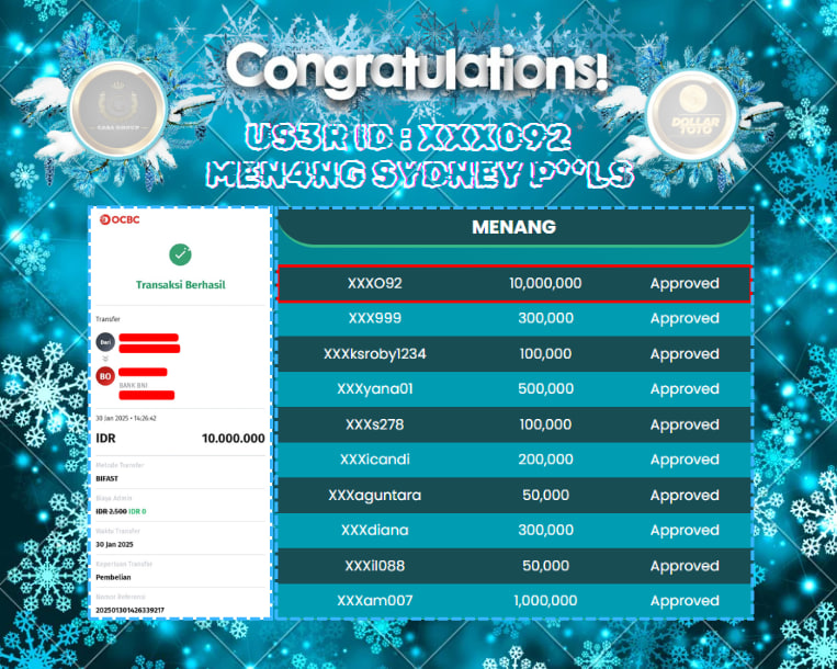 SELAMAT ATAS JACKPOT PAUS UNTUK MEMBER DOLLARTOTO DENGAN USER ID : XXX092 YANG TELAH BERHASIL MENANG PADA PASARAN SYDNEY SEBESAR Rp. 10.000.000,-