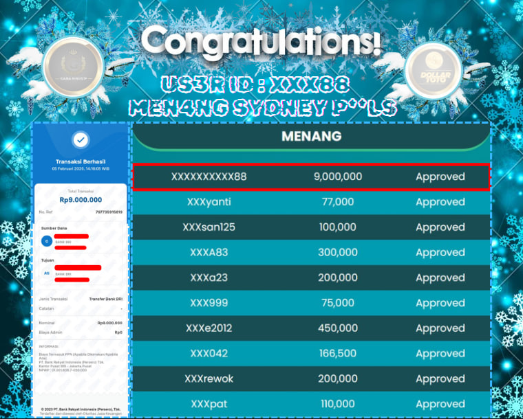 SELAMAT ATAS JACKPOT PAUS UNTUK MEMBER DOLLARTOTO DENGAN USER ID : XXX88 YANG TELAH BERHASIL MENANG PADA PASARAN SYDNEY SEBESAR Rp. 9.000.000,-