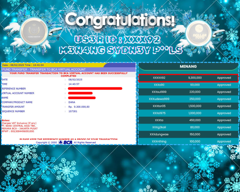 SELAMAT ATAS JACKPOT PAUS UNTUK MEMBER DOLLARTOTO DENGAN USER ID : XXX92 YANG TELAH BERHASIL MENANG PADA PASARAN SYDNEY SEBESAR Rp. 9.300.000,-