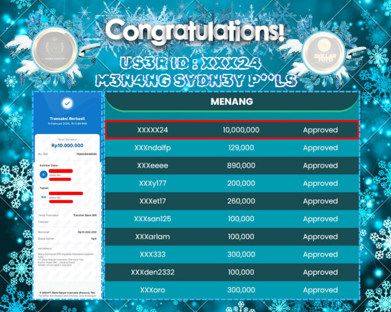 SELAMAT ATAS JACKPOT PAUS UNTUK MEMBER DOLLARTOTO DENGAN USER ID : XXX24 YANG TELAH BERHASIL MENANG PADA PASARAN SYDNEY SEBESAR Rp. 10.000.000,-