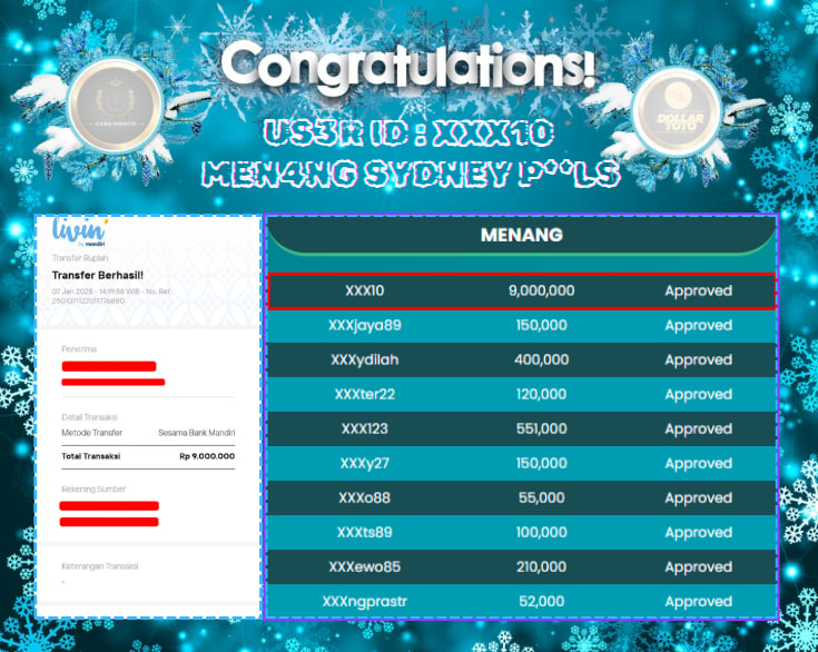 SELAMAT ATAS JACKPOT PAUS UNTUK MEMBER DOLLARTOTO DENGAN USER ID : XXX10 YANG TELAH BERHASIL MENANG PADA PASARAN SYDNEY SEBESAR Rp. 9.000.000,-