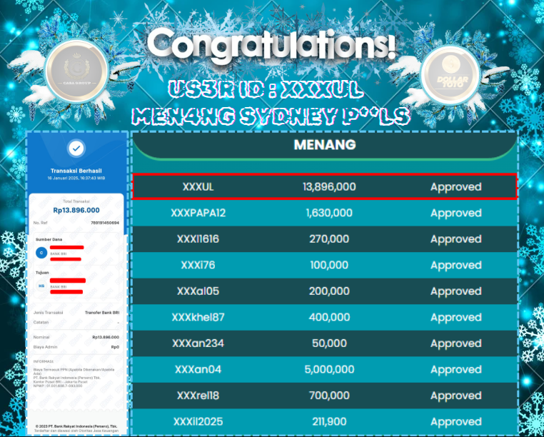 SELAMAT ATAS JACKPOT PAUS UNTUK MEMBER DOLLARTOTO DENGAN USER ID : XXXUL YANG TELAH BERHASIL MENANG PADA PASARAN SYDNEY SEBESAR Rp. 13.896.000,-