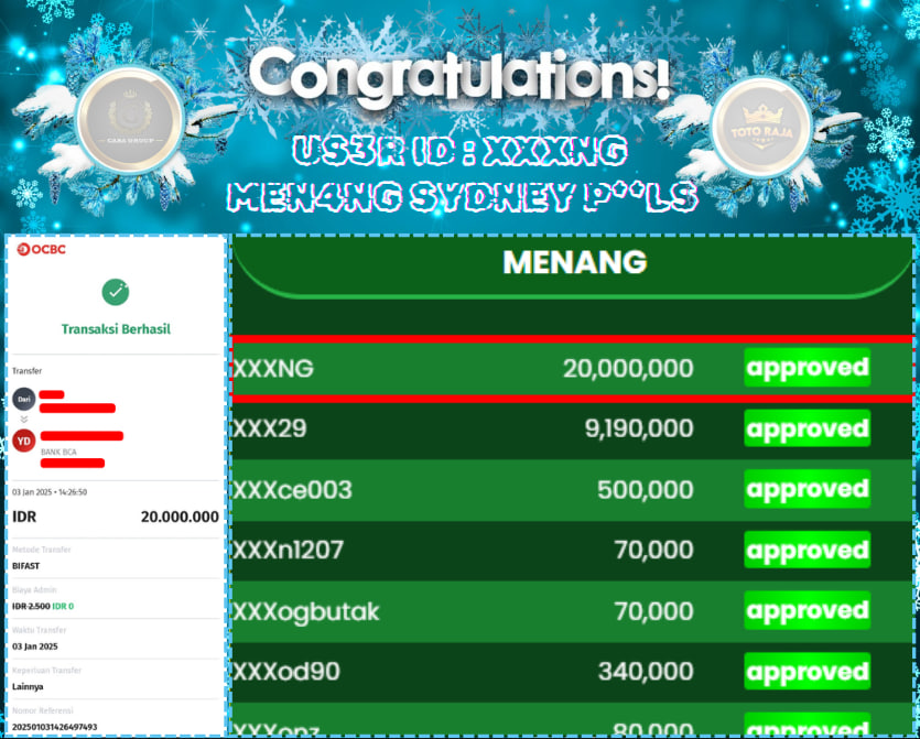 SELAMAT ATAS JACKPOT PAUS UNTUK MEMBER TOTORAJA DENGAN USER ID : XXXNG YANG TELAH BERHASIL MENANG PADA PASARAN SYDNEY SEBESAR Rp. 20.000.000-