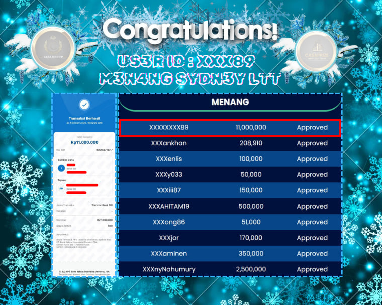 SELAMAT ATAS JACKPOT PAUS UNTUK MEMBER CASAPRIZE DENGAN USER ID : XXX89 YANG TELAH BERHASIL MENANG PADA PASARAN SYDNEY LOTTO SEBESAR Rp. 11.000.000,-