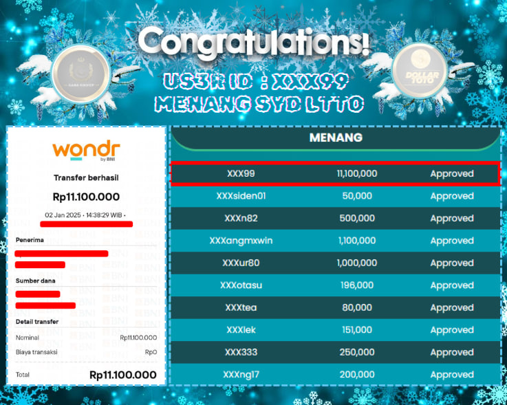 SELAMAT ATAS JACKPOT PAUS UNTUK MEMBER DOLLARTOTO DENGAN USER ID : XXX99 YANG TELAH BERHASIL MENANG PADA PASARAN SYDNEY LOTTO SEBESAR Rp. 11.100.000,-