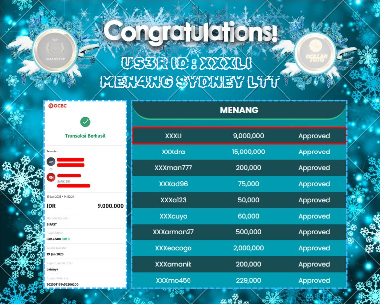 SELAMAT ATAS JACKPOT PAUS UNTUK MEMBER DOLLARTOTO DENGAN USER ID : XXXLI YANG TELAH BERHASIL MENANG PADA PASARAN SYDNEY LOTTO SEBESAR Rp. 9.000.000,-