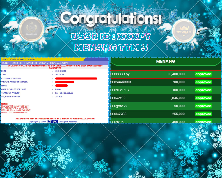 UNTUK DANA KEMENANGAN SUDAH LANGSUNG DIBAYAR LUNAS, UNTUK MEMBER YANG BELUM BERHASIL MENDAPATKAN KEMENANGAN BESAR JANGAN BERKECIL HATI SEGERA DAFTARKAN AKUN ANDA AGAR BISA MENDAPATKAN KEMENANGAN YANG BERLIMPAH .